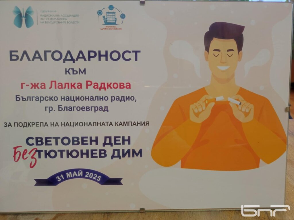 С грамота и думи на благодарност Институтът за здравно образование и Националната асоциация за профилактика на белодробните заболявания почетоха и тази година Лалка Радкова. Те дадоха висока оценка на нейните професионализм и отдаденост на каузата - Световен ден без тютюнев дим.