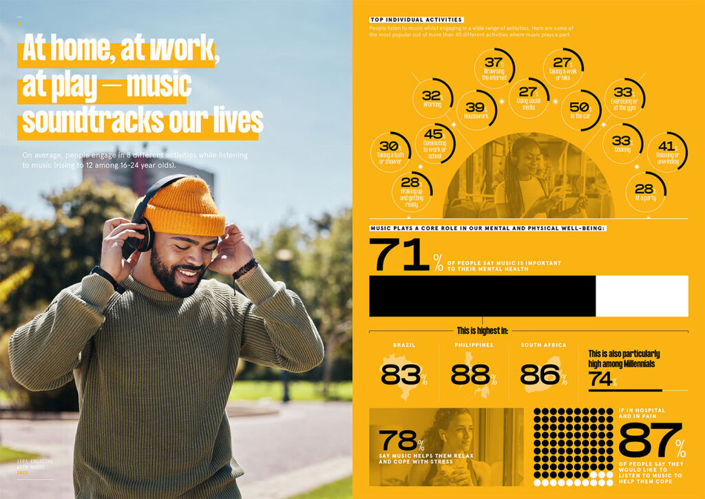 Музиката е саундтрак за най-различни занимания - в колата, напът към работа или училище, при релакс, вършене на домакинска работа и т.н. В доклада на IFPI се отбелязва и значението на песните за нашето благосъстояние. 71% казват, че музиката е важна за психичното им здраве, докато 78% посочват, че музиката им помага за релакс и справяне със стрес.