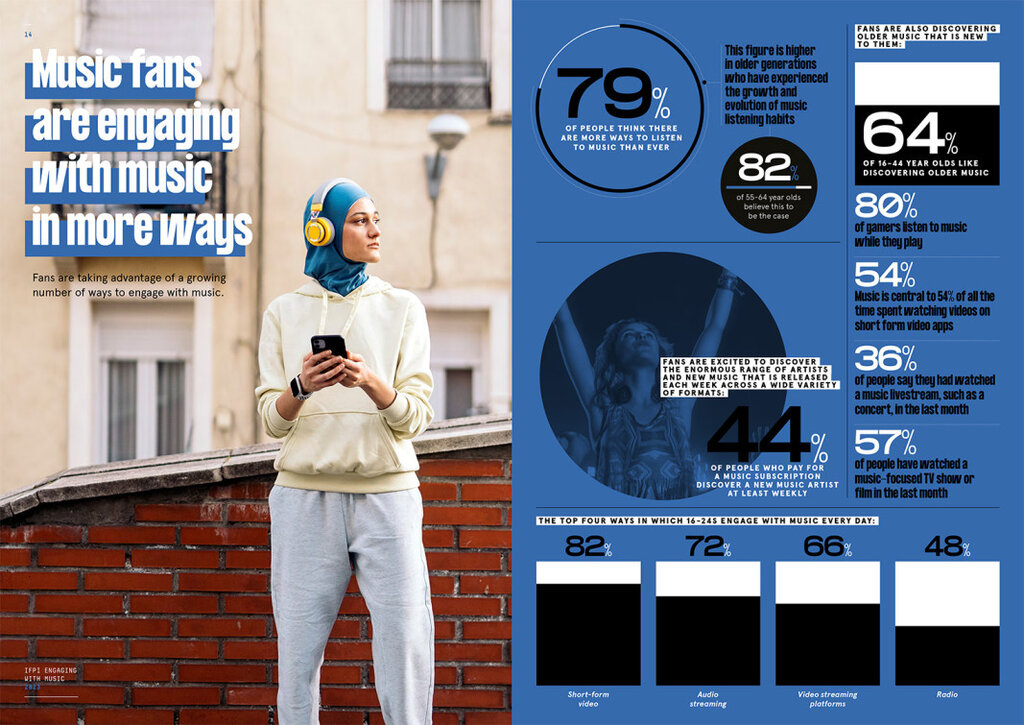 На седмица слушането на музика е средно 20.7 часа, което е скок от 2022-ра, когато е било 20.1 часа. Покачването според авторите на проучването е еквивалентно на 13 триминутни песни на седмица.