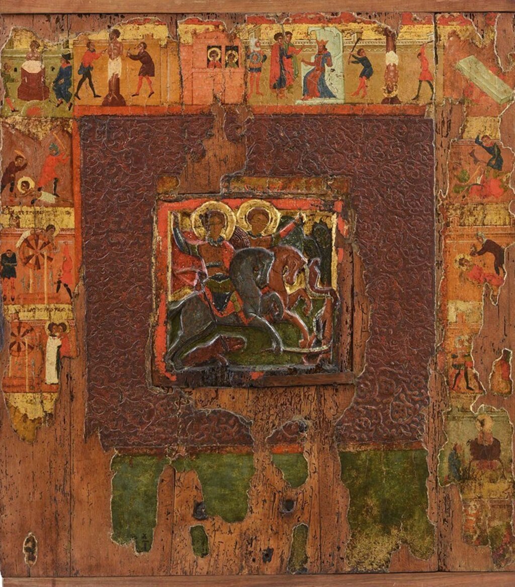 Das Problem bei der Datierung der Ikone ist ihr zusammengesetzter Aufbau, erklärt die Restauratorin. Der älteste Teil der Ikone zeigt eine grobe Reliefdarstellung der heiligen Reiter auf einer fast quadratischen Holztafel. Sie ist in einen viel später gemalten Rahmen eingefasst, der Szenen aus dem Leben und Martyrium der beiden Heiligen zeigt. Interessant ist der Übergang, den der mittelalterliche Meister zwischen der Hauptikone und dem Rahmen geschaffen hat. Für den unwissenden Bittsteller, der vor der Ikone sieht, sieht es so aus, als ob eine feine Haut zwischen dem Rahmen und den Heiligen geklebt wurde. Der Effekt wurde durch das Auftragen mehrerer Schichten Grundierung auf den hölzernen Sockel und die anschließende Herstellung eines zusätzlichen Reliefs erzielt.