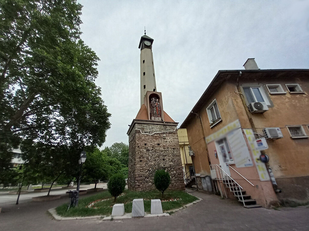 In der Nische, in der sich ursprünglich die Uhr befand, stehen die Skulpturen der Schutzheiligen von Pazardzhik - der Heiligen Konstantin und Helena.