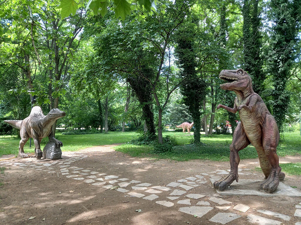 Im Park kann man viele schöne Skulpturen entdecken und sogar eine Gruppe von Dinosauriern