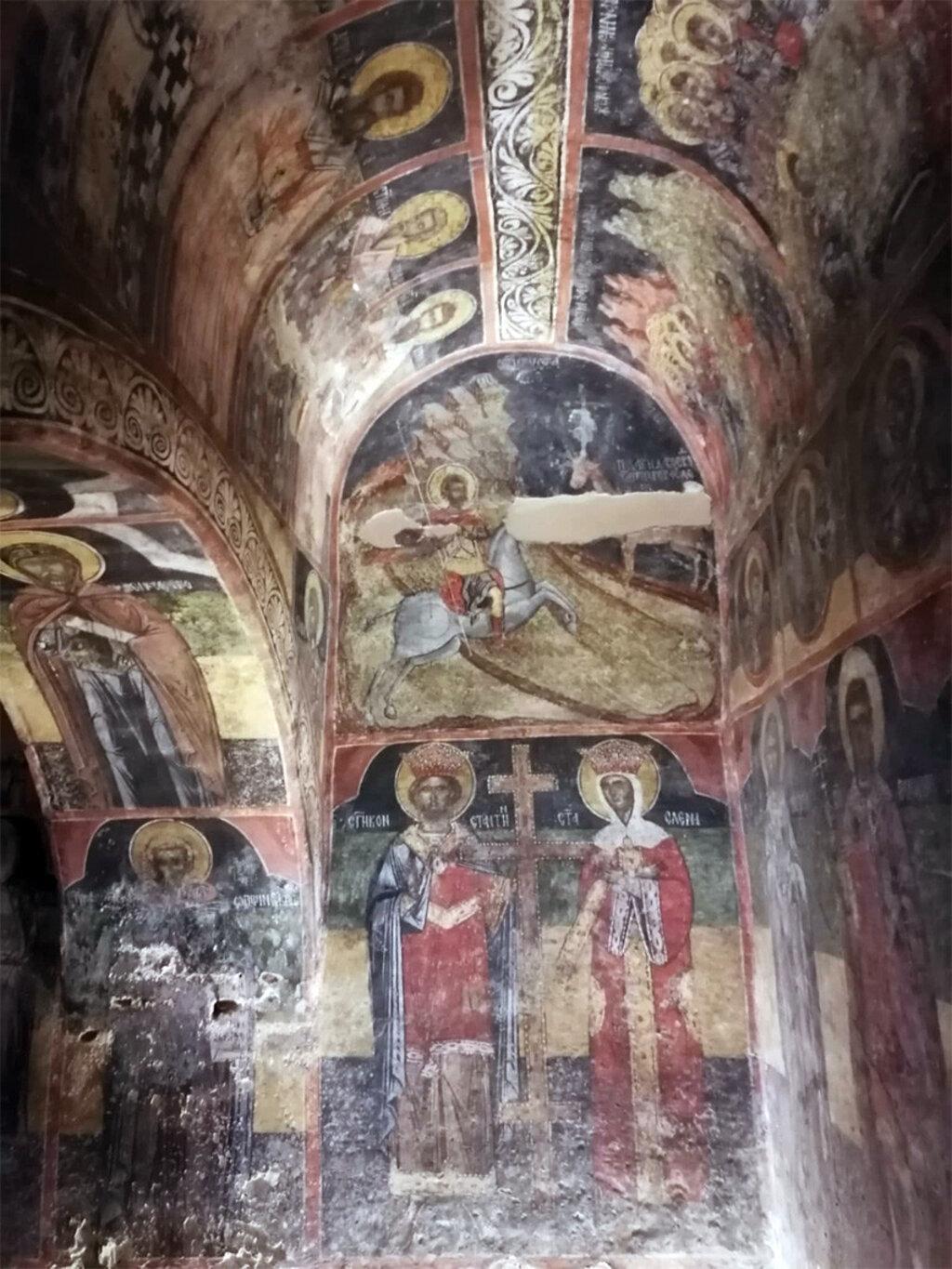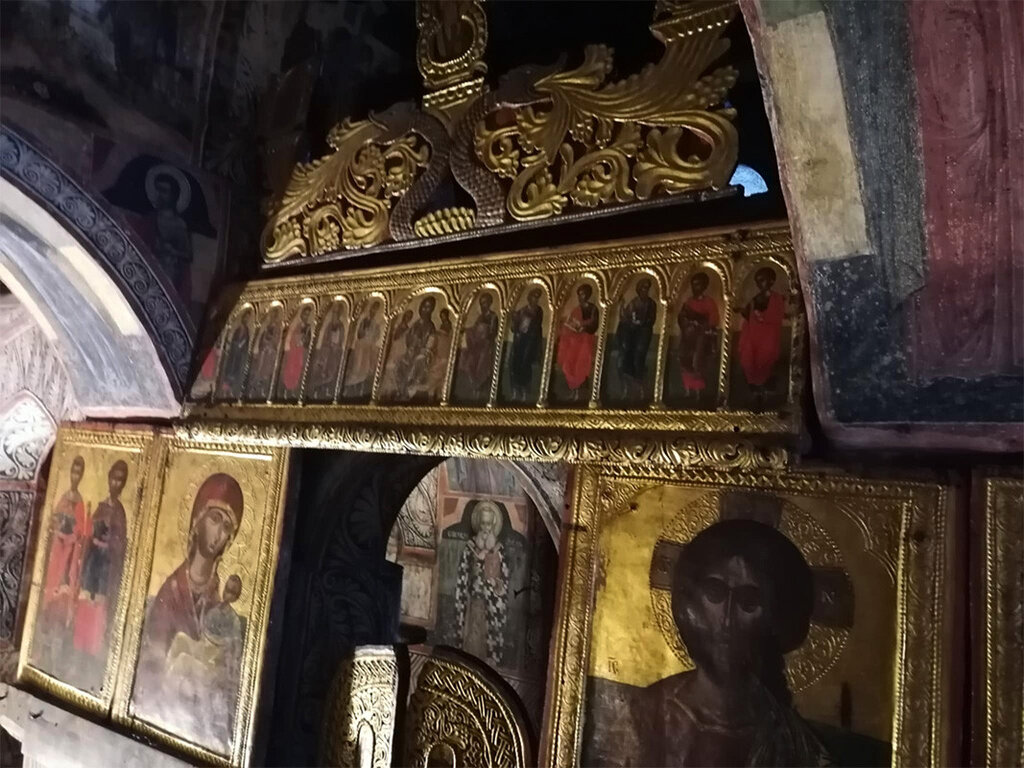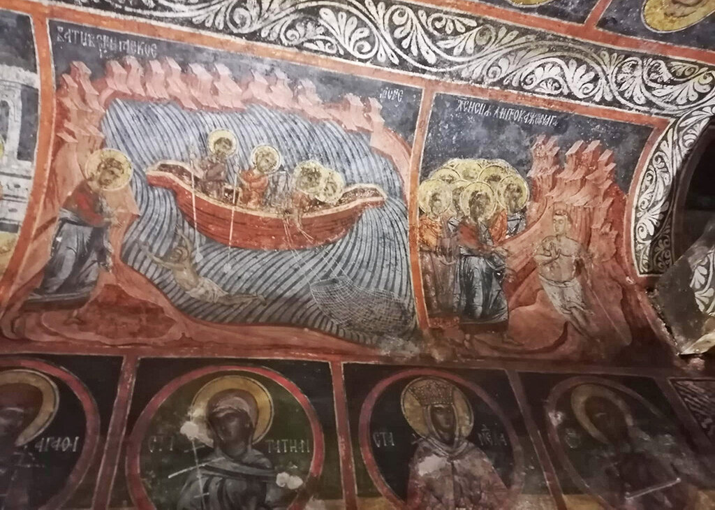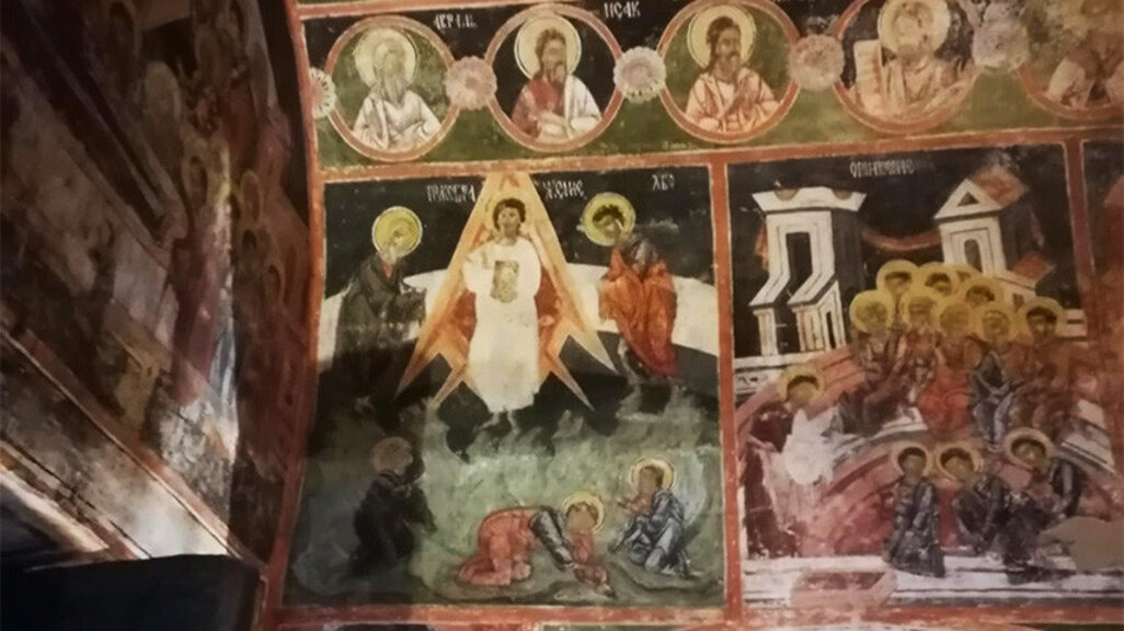 Es curioso además el número de las imágenes de santas, que superan la treintena. La iglesia también es única por su fresco de la escena de la Transfiguración, donde Jesucristo aparece representado en algo parecido a una nave espacial.