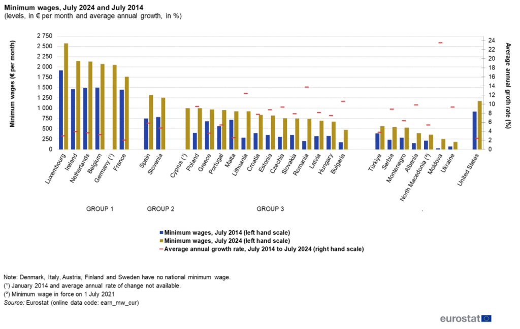 Най-ниската минимална работна заплата е в България – 477 евро, а най-високата е в Люксембург – 2570 евро, това сочат данните на Евростат за юли 2024 година. В сравнение с юли миналата година най-ниското възнаграждение у нас бележи ръст от 78 евро, а в Люксембург с близо 70.