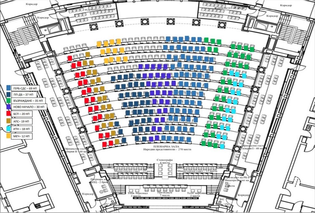 "При 8 парламентарни групи няма как да са доволни хората, освен може би колегите от ГЕРБ и ДПС – Ново начало, защото те не направиха никакви компромиси", каза Стоев, чиято група ще бъде разделена от двете страни на пътеката (виж графиката по-долу)