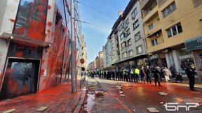 Напрежението пред сградата на представителството на Европейската комисия и Европейския парламент в София възникна вчера следобед. Протестиращи хвърляха червена боя, бомбички и яйца по сградата, вратата ѝ беше запалена. Полицаите изблъскаха протестиращите по-далеч от сградата. На място дойдоха пожарникари и представители на жандармерията, линейки.