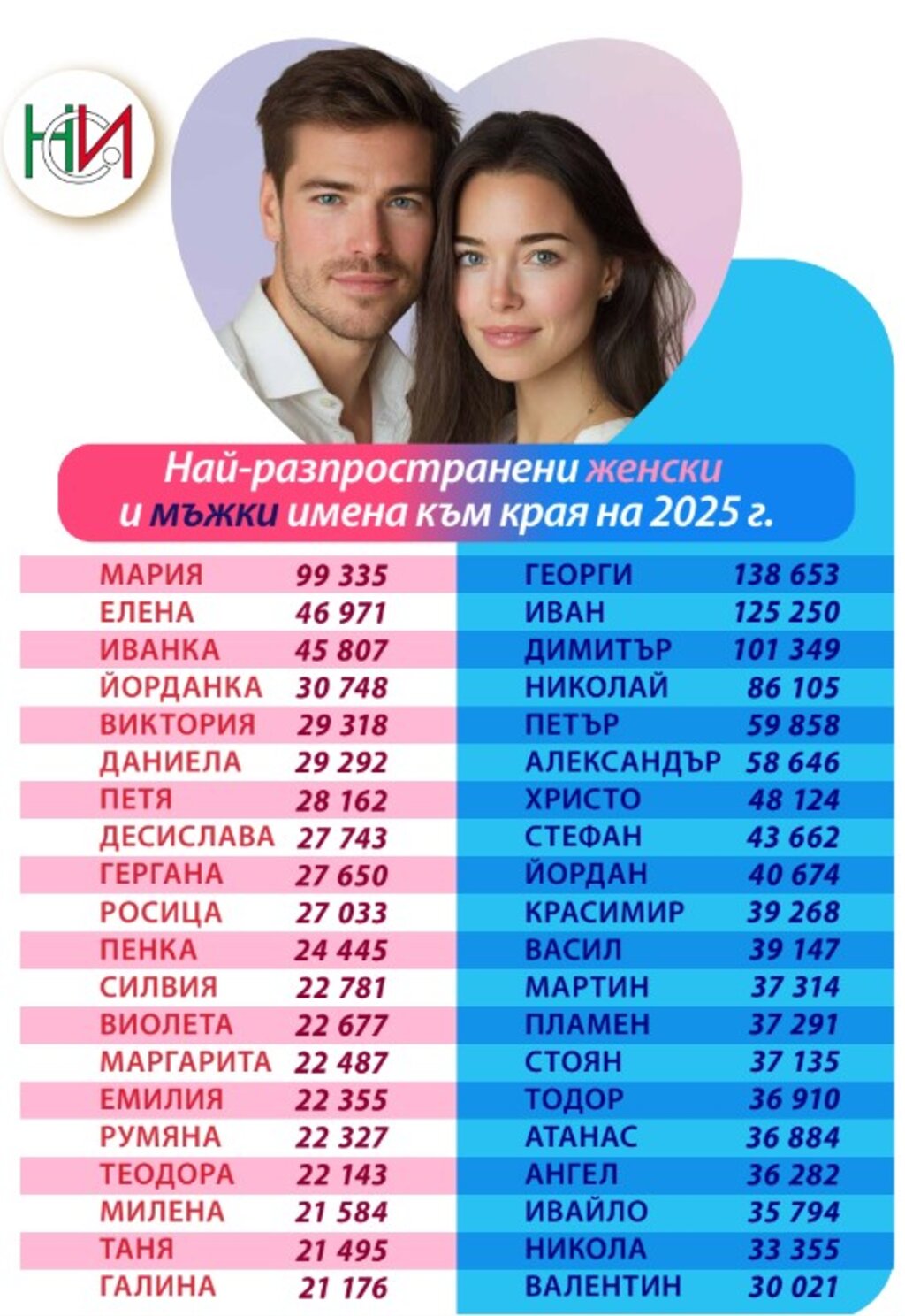 Към края на 2025 г. най-разпространеното женско име остава Мария. Мариите са 99 335 – два пъти повече от следващите ги в класацията Елена и Иванка. При мъжете разликите не са толкова големи, а първенството се държи от Георги, Иван и Димитър.