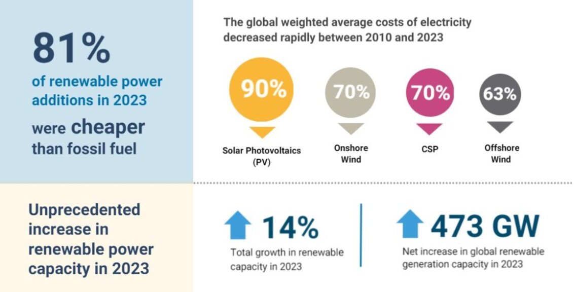"Евтините възобновяеми енергийни източници представляват ключов стимул за значително увеличаване на амбицията и утрояване на капацитета за възобновяема енергия до 2030 г., както е моделирано от IRENA и определено от консенсуса, постигнат на срещата COP28 в Дубай".