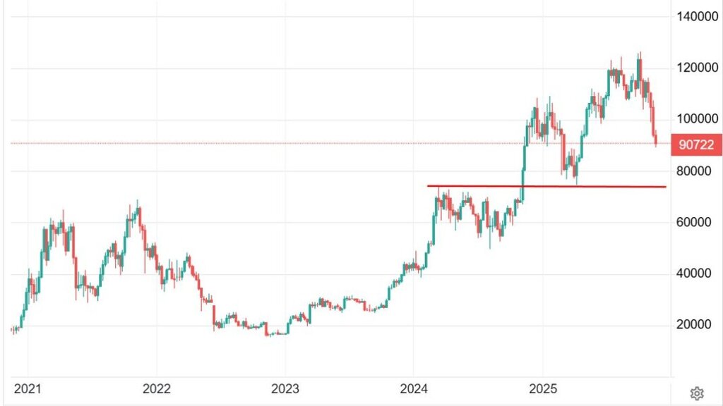 Според някои анализатори, следващото важно ниво на подкрепа за биткойна е около 75 000 долара (дъна от началото на април 2025 г. и важен бивш връх от март 2024 г.), като не е изключено неговото достигане, ако волатилността на финансовите пазарите остане висока.
