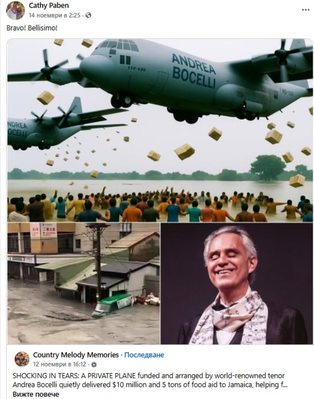 В информацията се казва, че частен самолет, финансиран и организиран от тенисиста, е направил дарението след най-силната буря в света за годината, без камери, без прожектори, без пресконференция, само от любов и човечност. Твърдението е споделено стотици пъти и има над 9300 реакции.