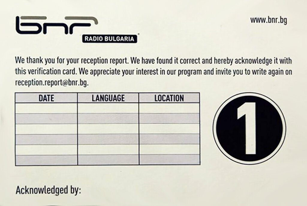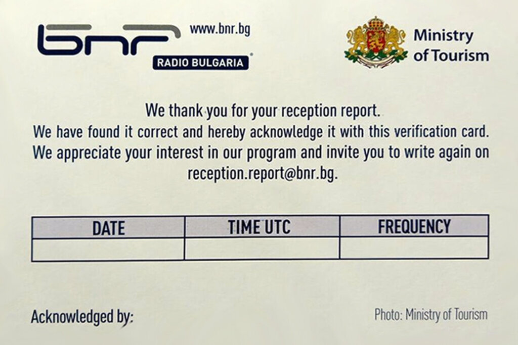 Серией из 12 карточек, изготовленных при любезном содействии Министерства туризма Республики Болгария, подтверждаются все сигналы Болгарского национального радио в эфире (программы "Горизонт", "Христо Ботев", региональные радиостанции и передачи "Радио Болгария").