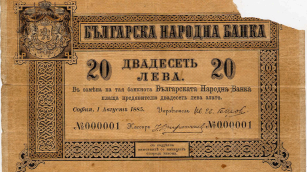 Новчаница од 20 лева која носи датум 1. август 1885. г. била је прва бугарска папирна новчаница штампана у Санкт Петербургу, Русија. Величина јој је 150 х 97 мм, у левом делу лица новчанице је водени жиг Бугарске народне банке. Оригинал прве бугарске новчанице чува се у Историјском музеју Габрова. Као могући прототип бугарског лева наводи се лављи долар (далер) – низоземска верзија популарне европске сребрне кованице, талер, који се у нашој земљи појавио у 17. веку.